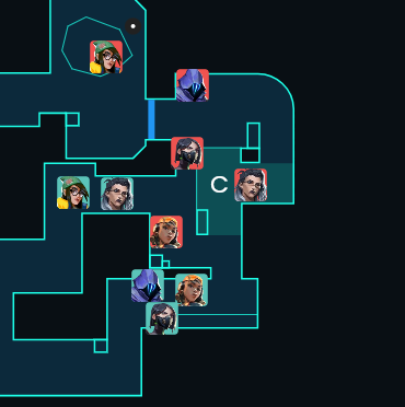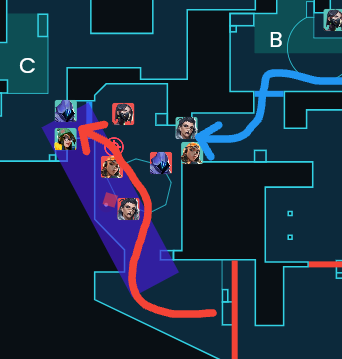 Aにプッシュ,人数が多いのを確認→Cにはじめからいるのですぐにこの有利状況を活かしてセットに行ける。