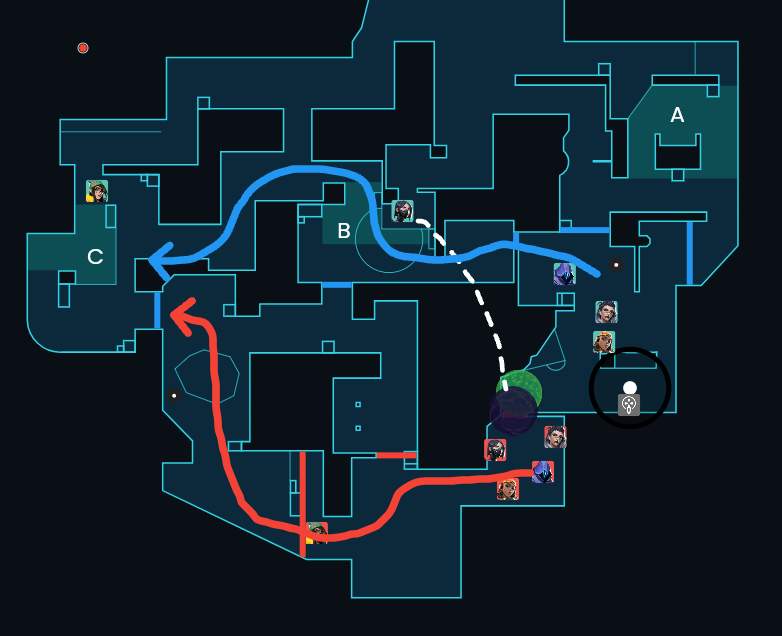 スキルを巧みに使い<u>高くとっていると思わせてCに誘導して罠を張る</u> 今までと同じようにスキルを使っているように思わせる。とくに相手が情報をとりやすいスキルはフェイクとして使える。音とかMapにうつるスキル。空爆にできるスキルは空爆にしてCに寄りやすくする。普通にAメインからロテするよりも距離が短い。
