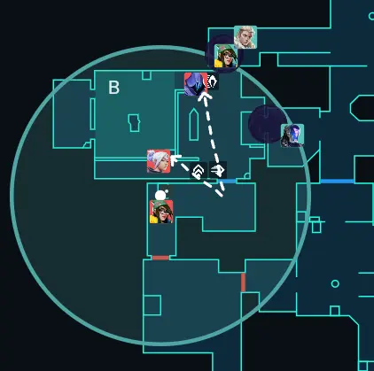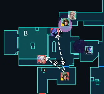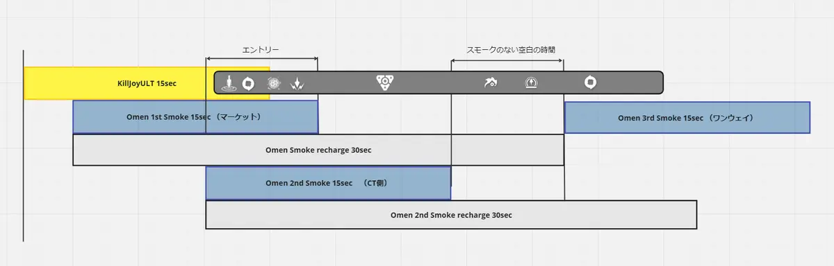 KillJoyULTの1秒半後にスモークを入れてULTの終わる2秒前くらいからエントリーを始めて5秒くらいでサイト中までエントリーしています。