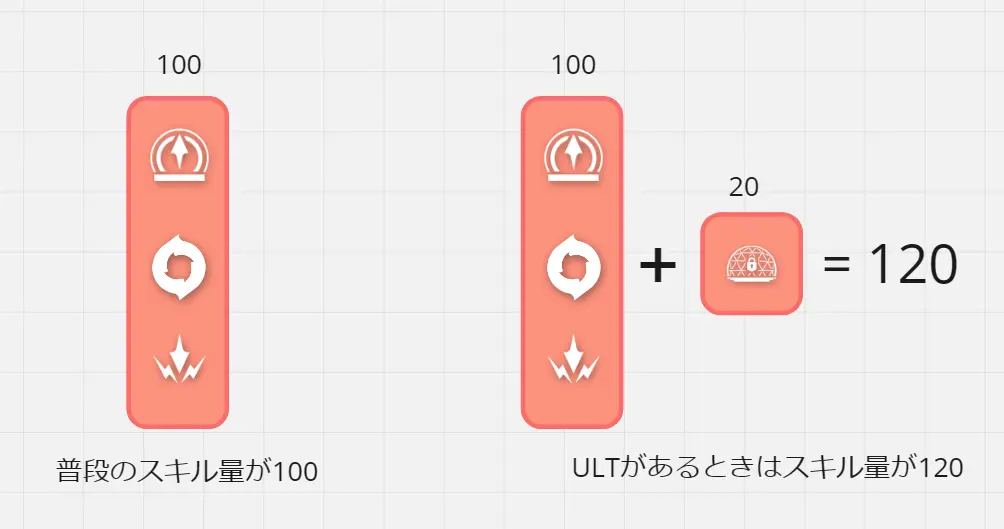 ULTがないときにもっている自分たちのスキル量が100に対して,ULTのあるときは120あると考えることができます。