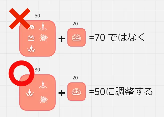 なので,普段セットの時に100のうち50つかっていたけど,ULT20があるなら普段のセット50+ULT20で合わせて70にするのではなく,20を節約して50になるようにスキルを減らしてセットは行うという考えがあります。