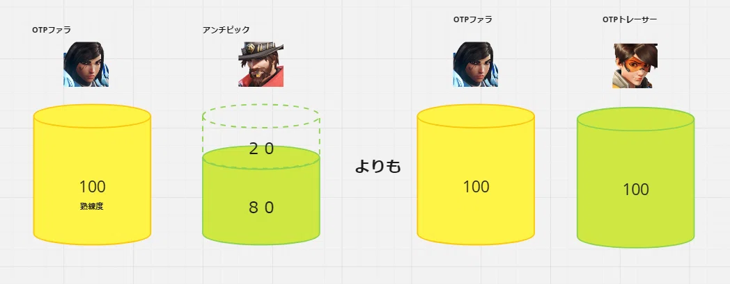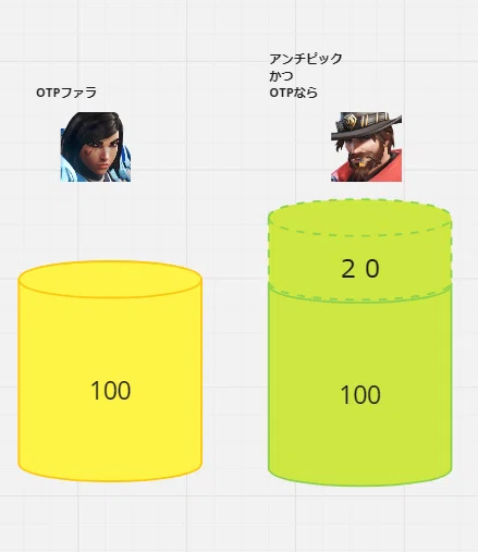 だからこそどのゲームもそうですが,このキャラなら相手よりもうまく使えるというOTPがいるといいし,OTPキャラが複数人いて、そのOTPキャラがもし相手のアンチピックになるのであれば,熟練度100プラスアンチピックとして20あるとして「100:120」で戦うことができるかもしれません。