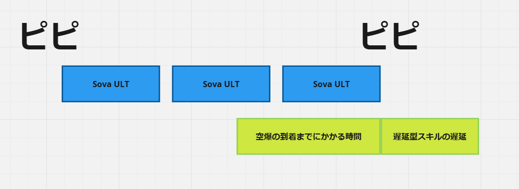 SovaULTの2発目を2秒後に再度打ちます。そうなると逆算でSovaULTが後遅延できるのは5秒になります。即着スキルが空爆に5秒かかる場合はこのタイミングで使えばジャストで遅延ができるというわけです。