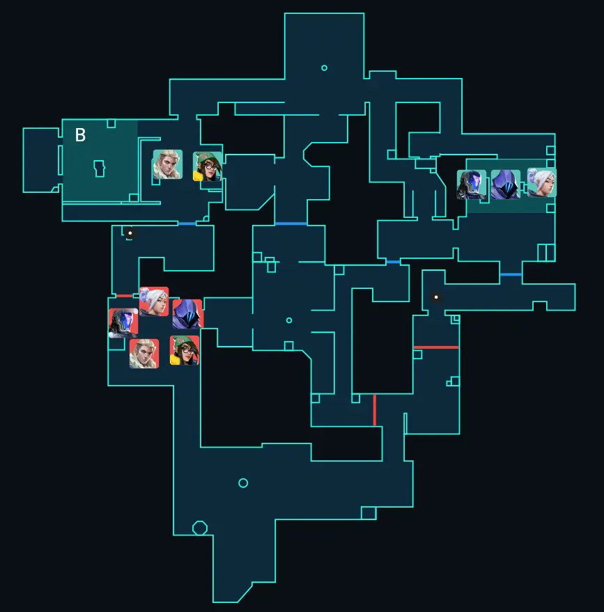 今までのラウンドの情報で守り側のKilljoyがBをまもっている×センチのサイトは初期配置の人数が少ない