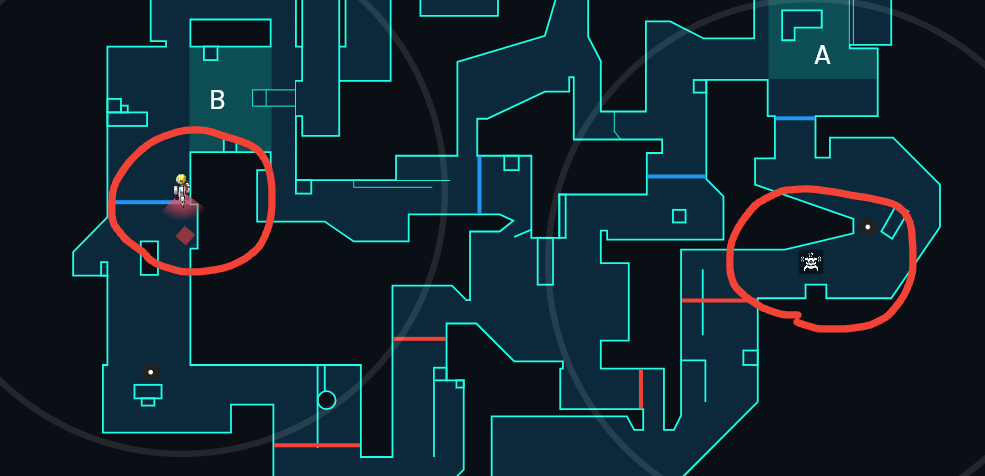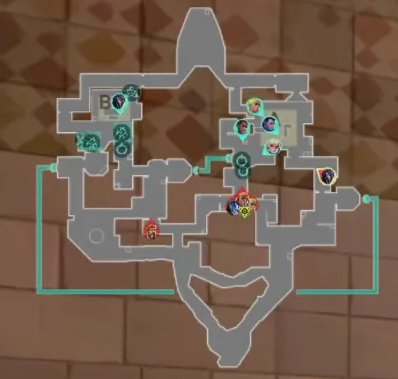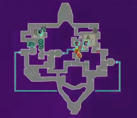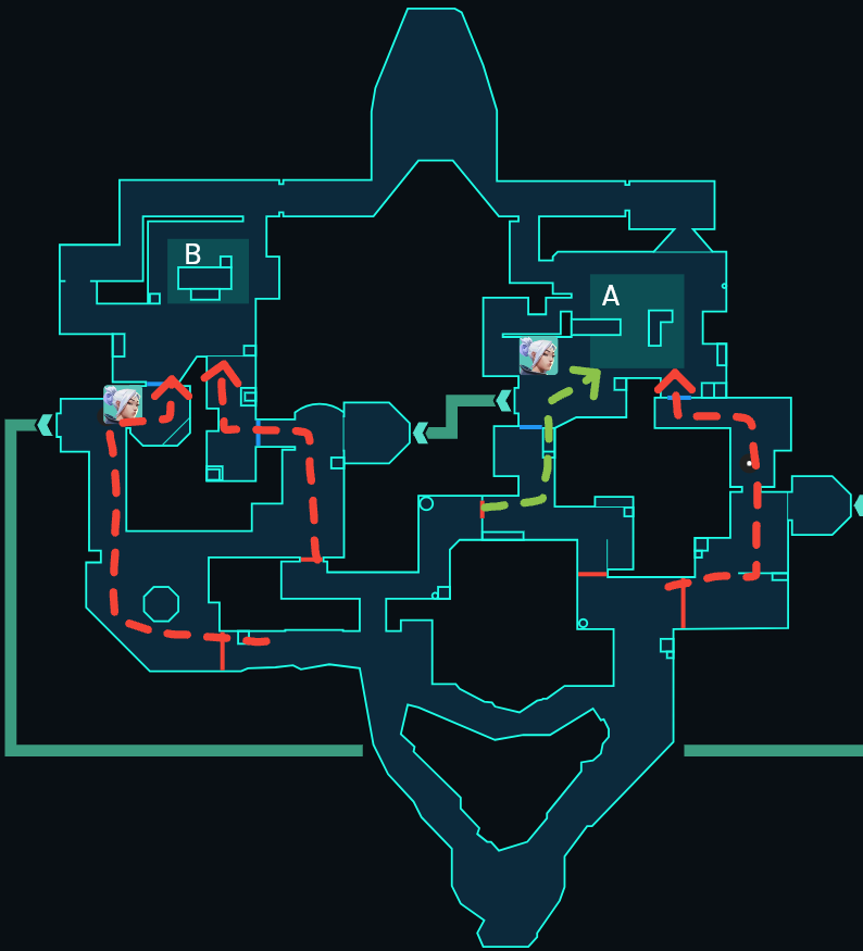 Bは前目で情報をとることで、味方が寄る時間が作れる。というマップ構造を生かした対策をBで行っているものになります。