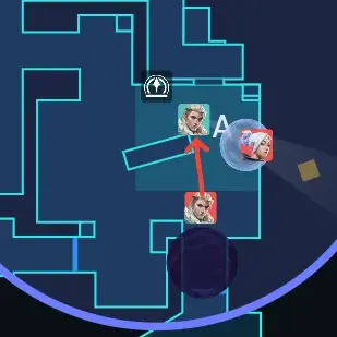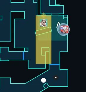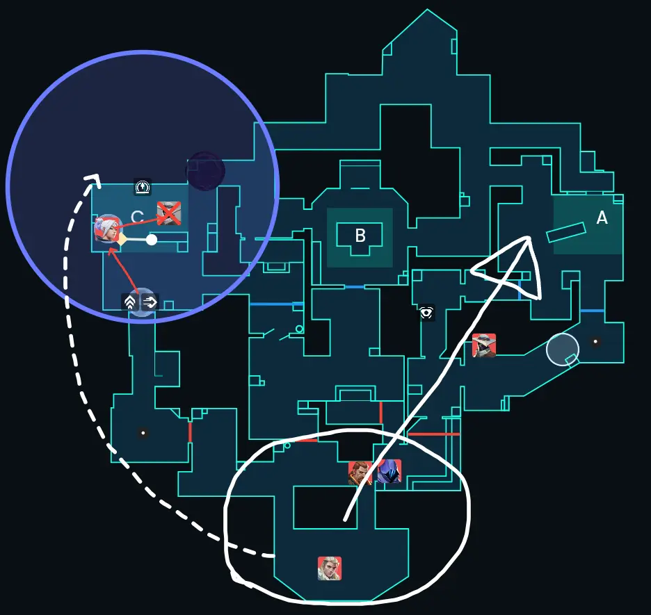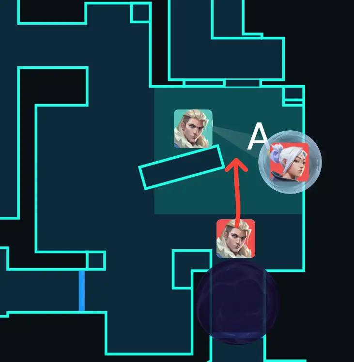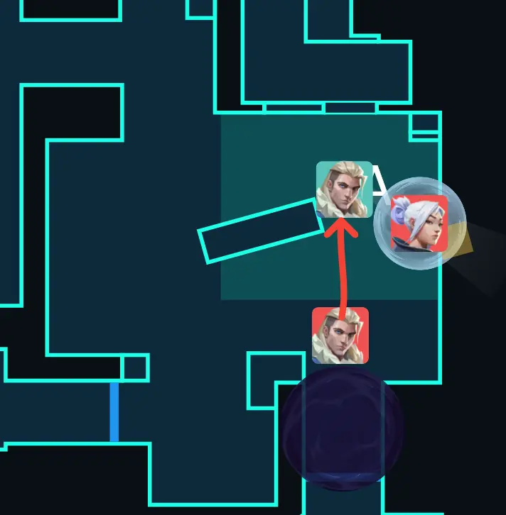 メインのOmenスモークを見るというのを一度やめて、一歩下がって攻め側のセカンドエントリー・後続がはいってきてもその斜線に入らないように体を移動してJettと1v1できるようにするのが普通です。