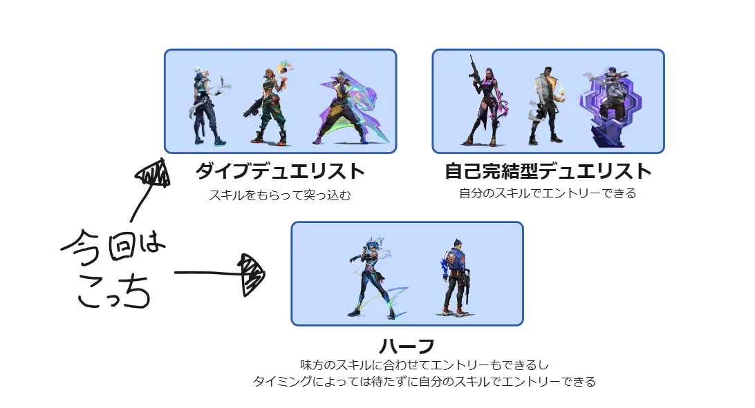 これらを説明するときにエントリーフラッガーだから、「チームの中ではじめに勝負してキルをとる人」と考える人もいると思います。