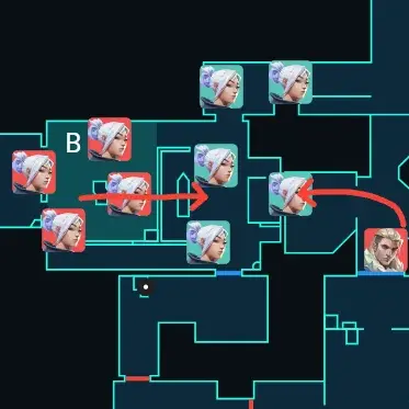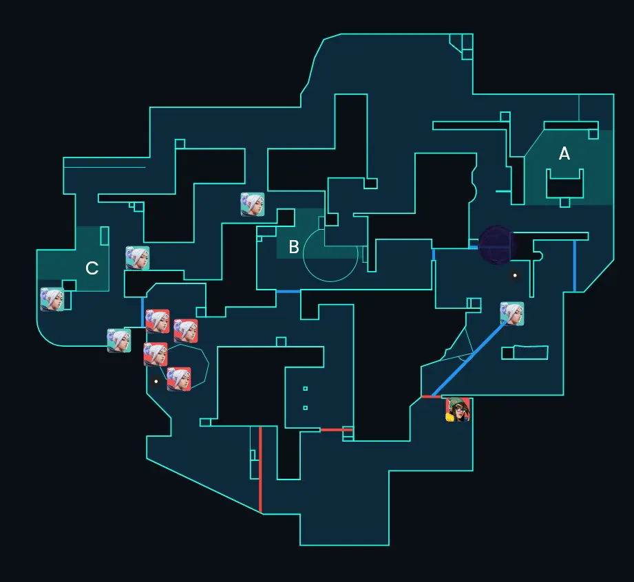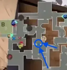 AメインからCTを経由してBのKilljoyのもとへ合流していきます。KAYOのナイフをよける必要はないのでここではあえて引っかかってAの可能性を作っています。