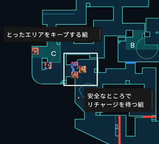 ホールドをする際にサイト中で全員でリチャージを待っていると相手がカウンターをとってくるかもしれない。なのでリスク分散でリチャージする組は安全なところ、とったエリアをキープしておく人を用意する配置。