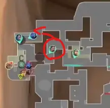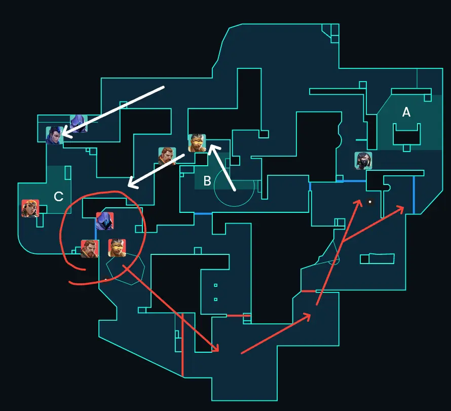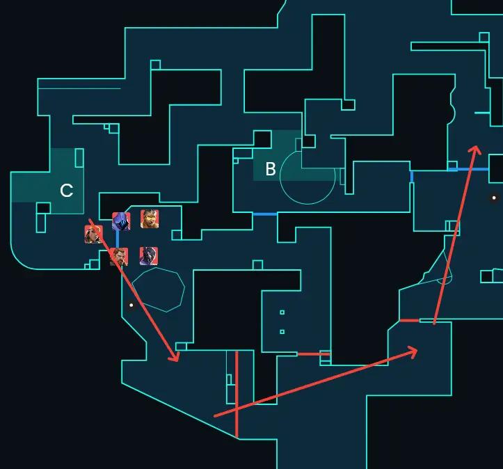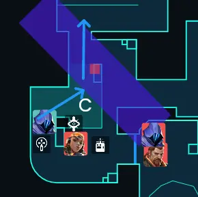 一度Cサイトにエントリーしてサイト中をとってからの展開の場合、相手の防衛視点だとCに大きく揺さぶられる配置になります。