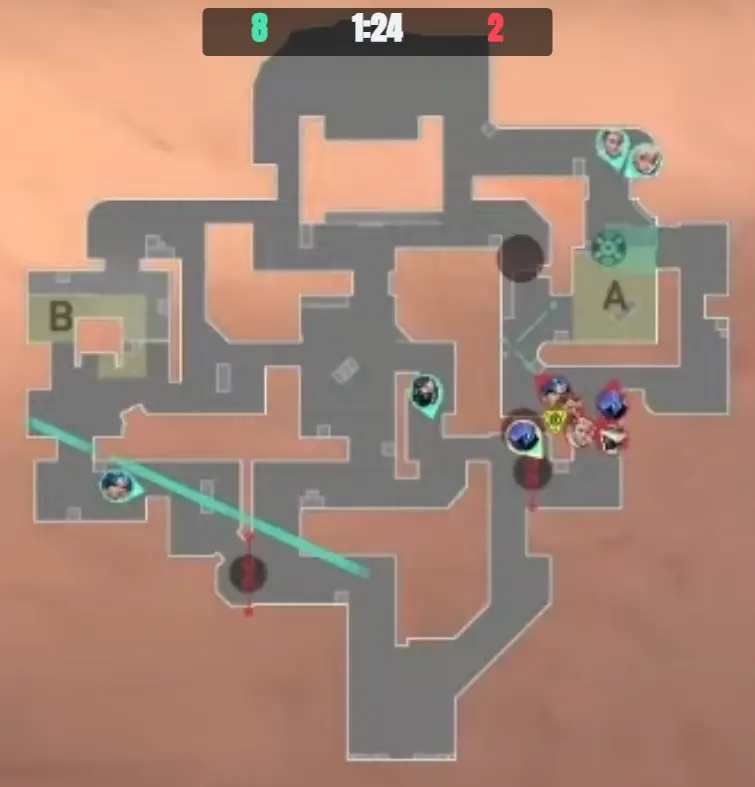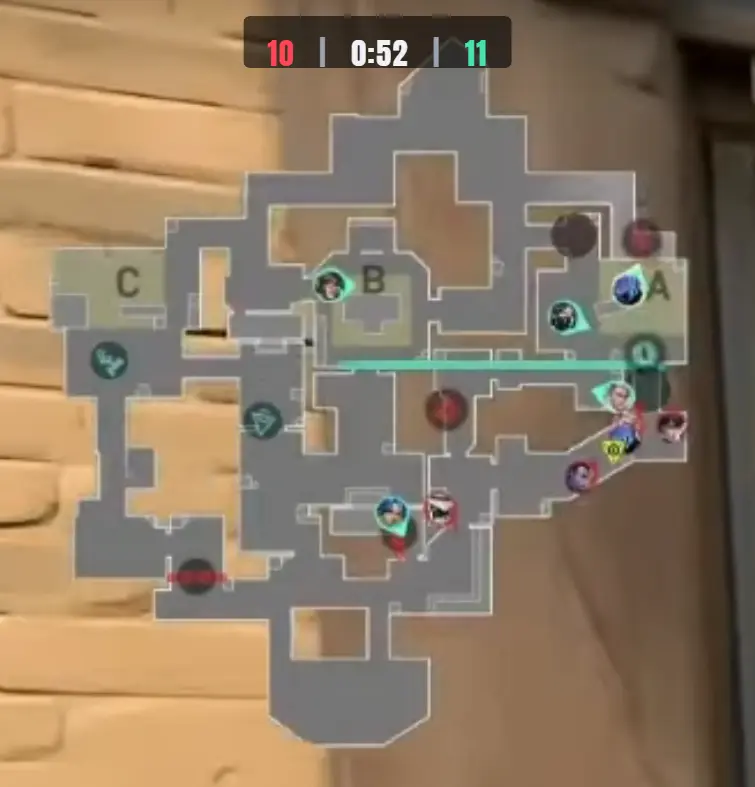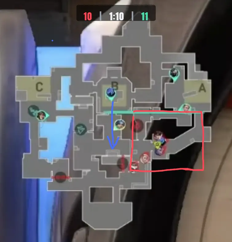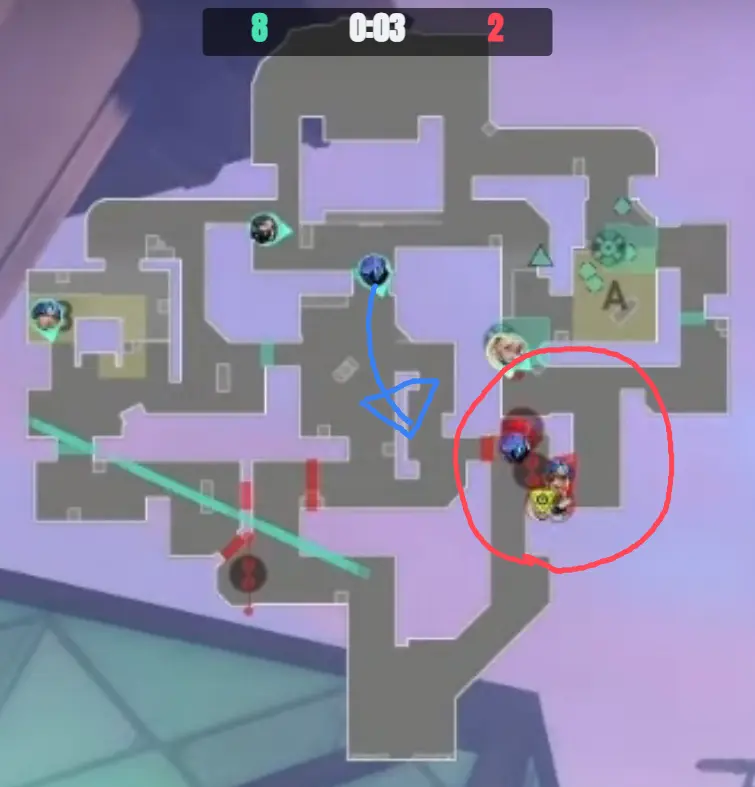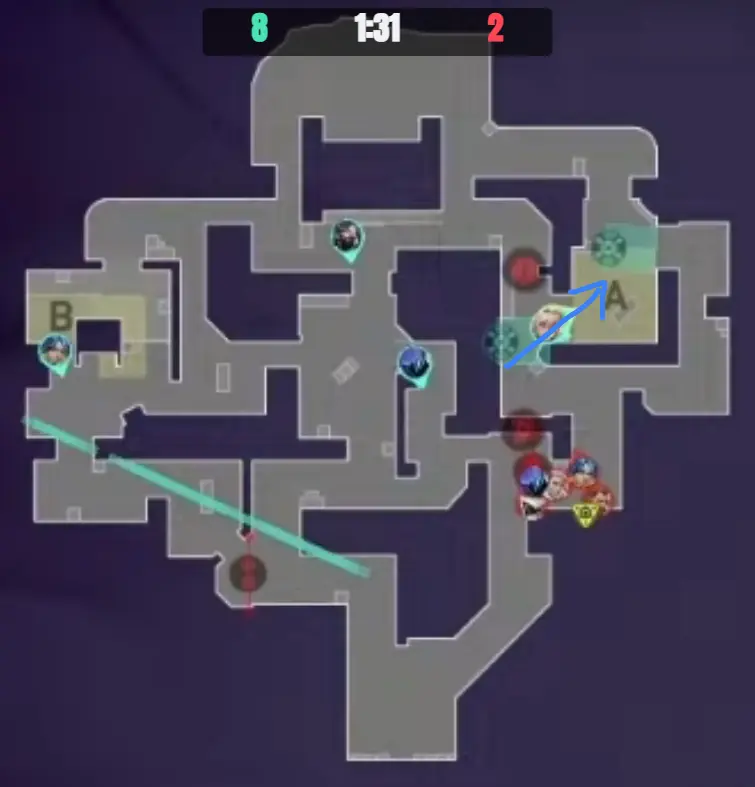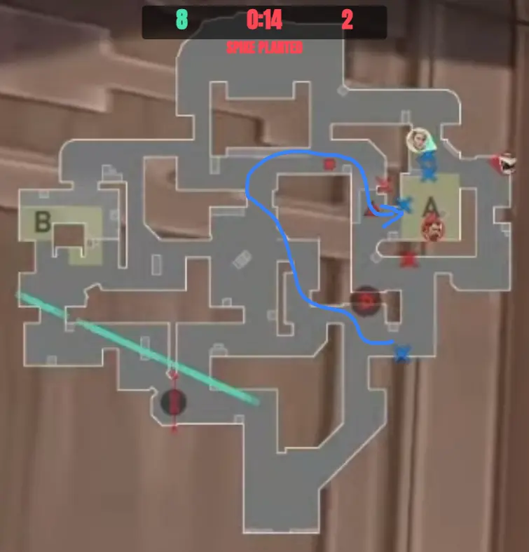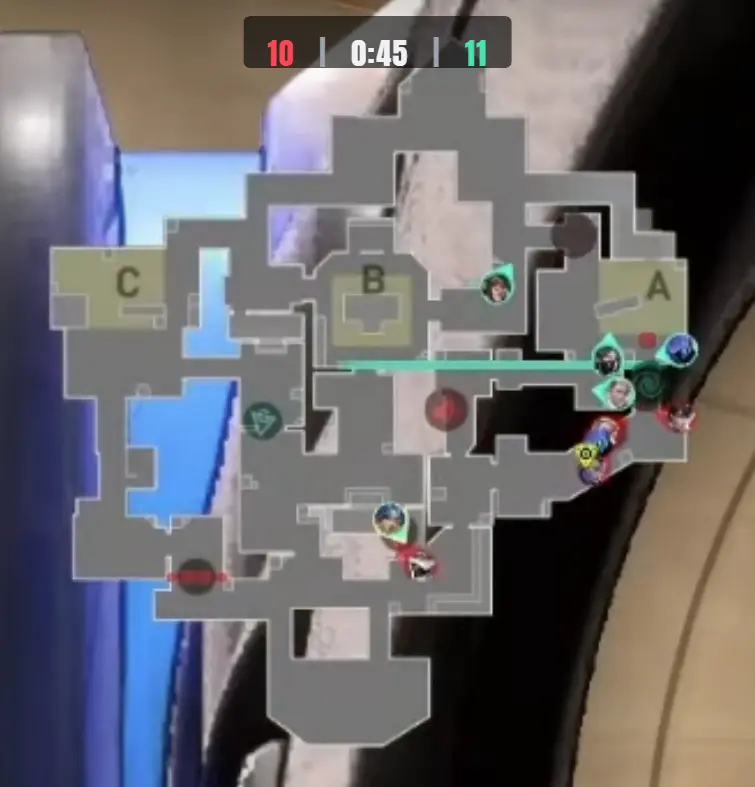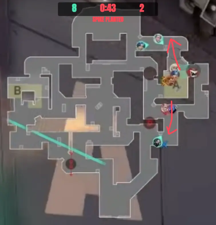 相手がそのままULTをつかってAに来るのであれば、攻め側のサイトエントリーのタイミングやプラントタイミングの人数が分散するタイミングを狙って裏をとりに行くこともできます。