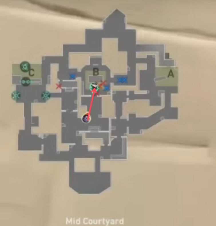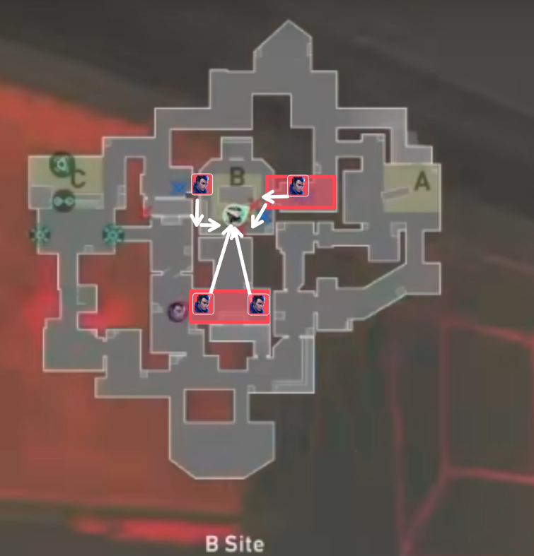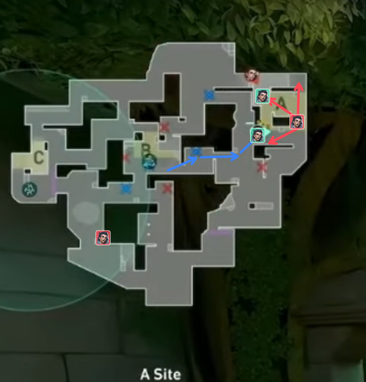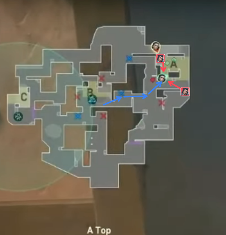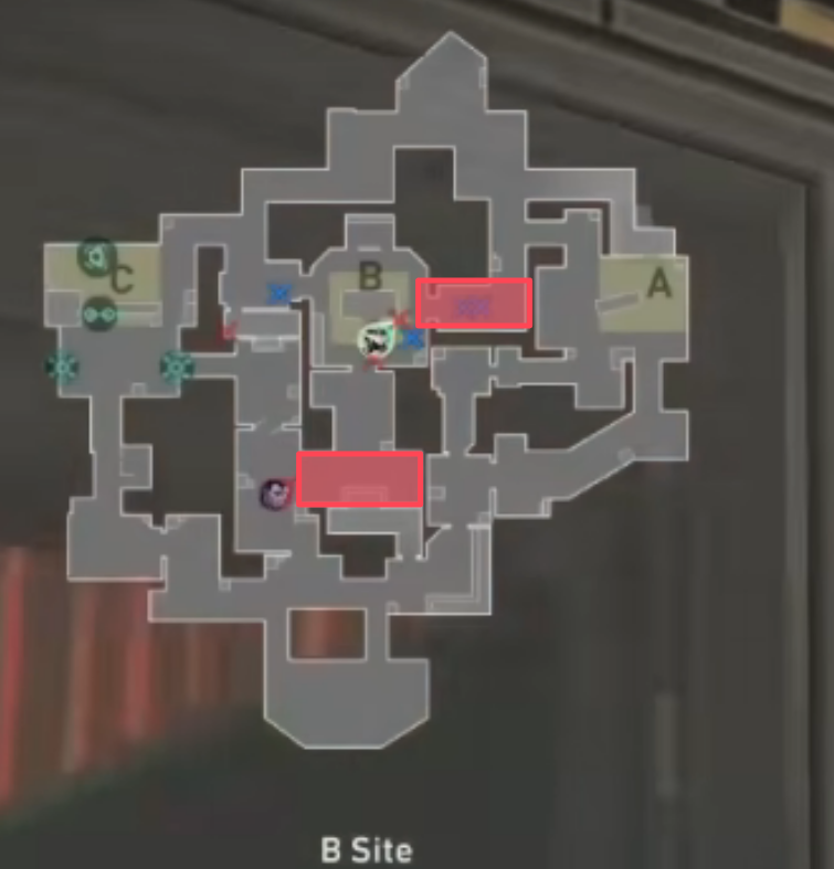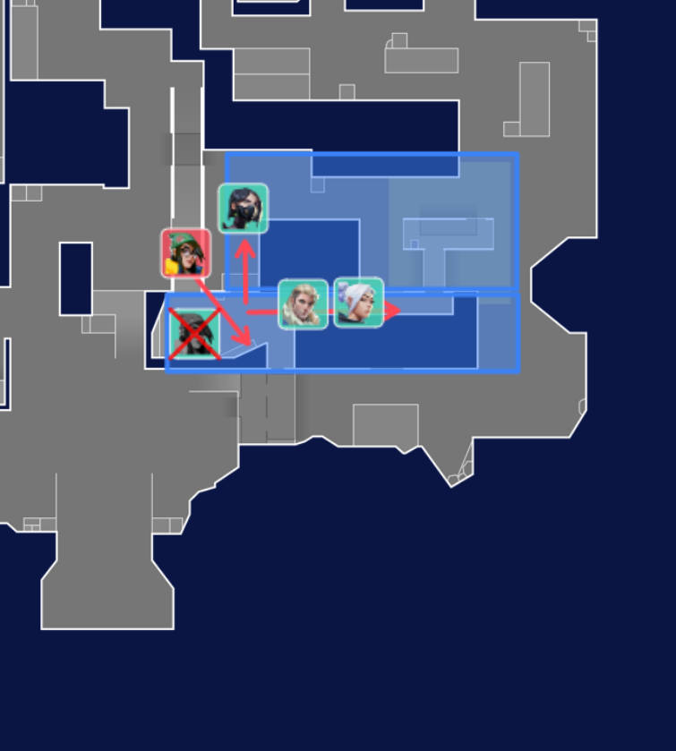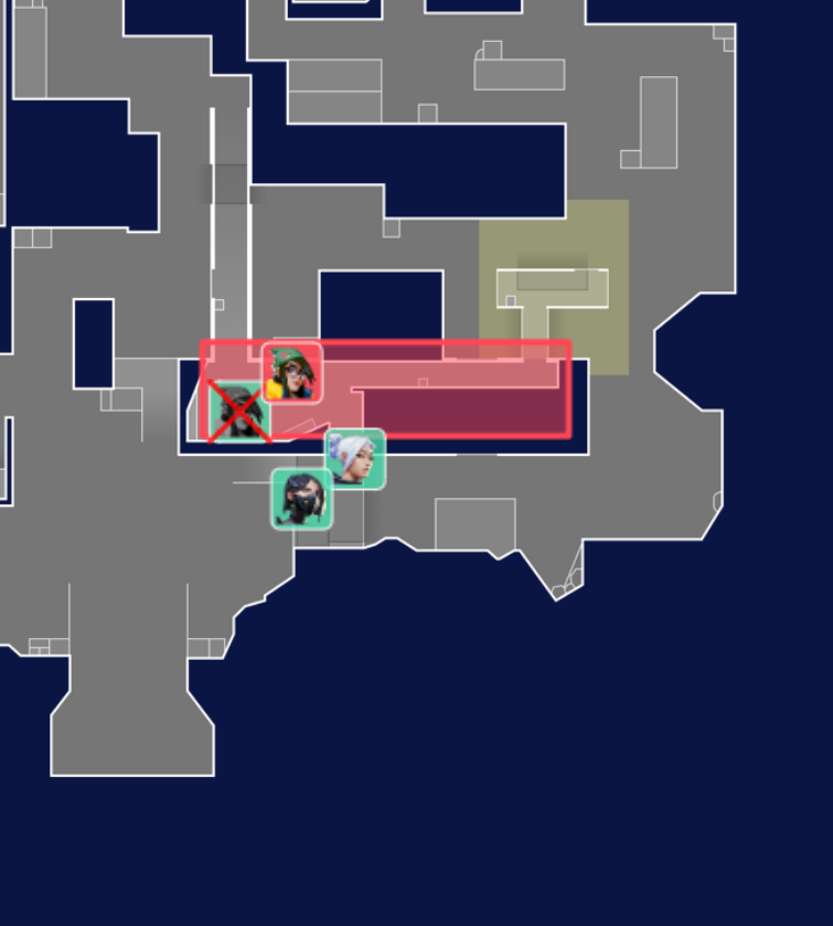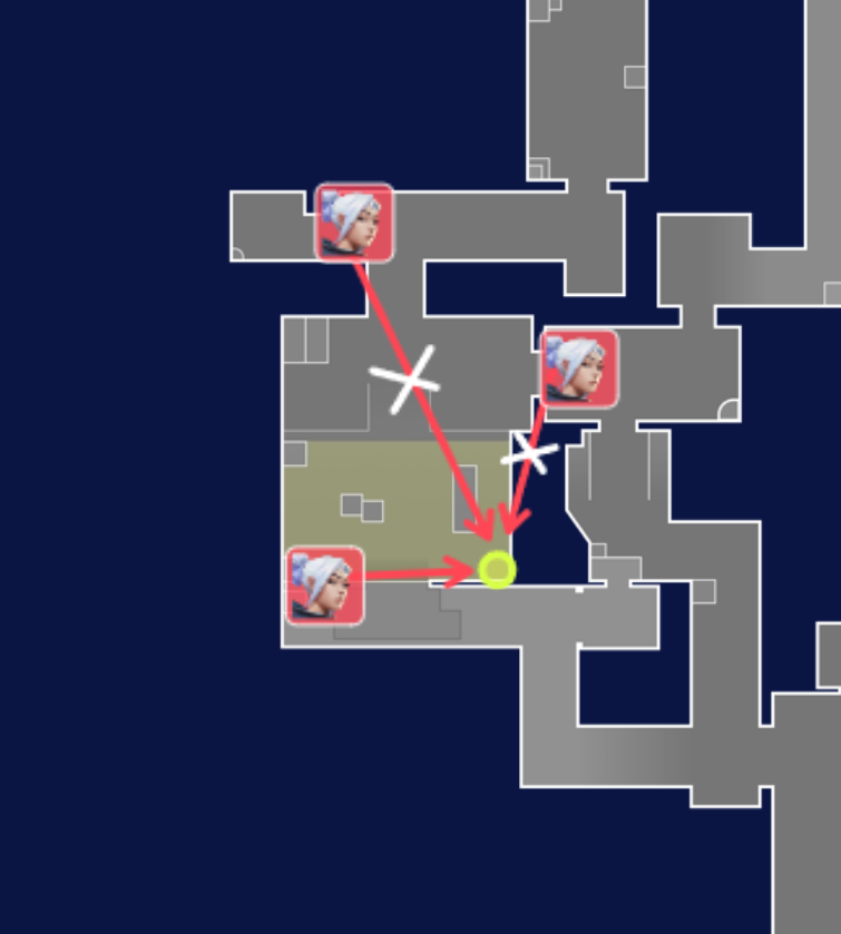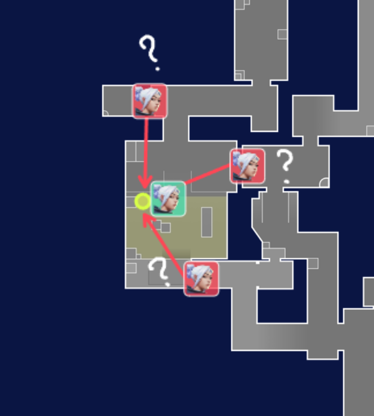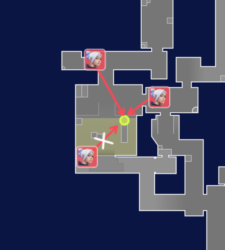 攻め側としても1v1で相手がどこからリテイクしてくるかわからないときに上図のようなポジションに入るとケアしなければいけないエリアが増えるので