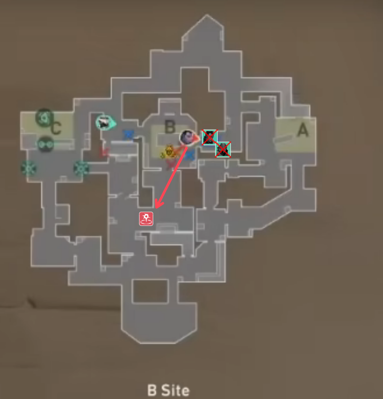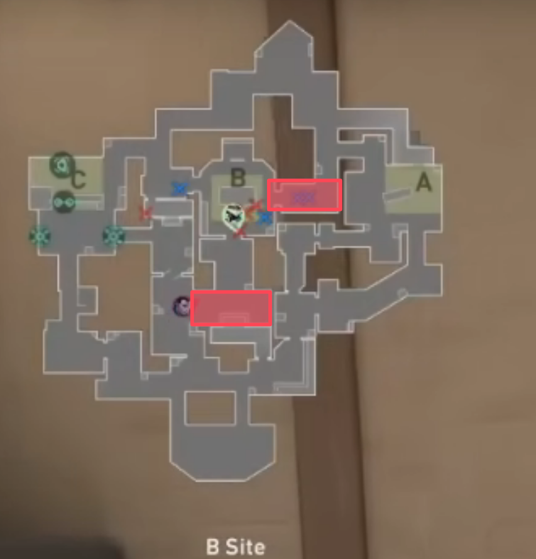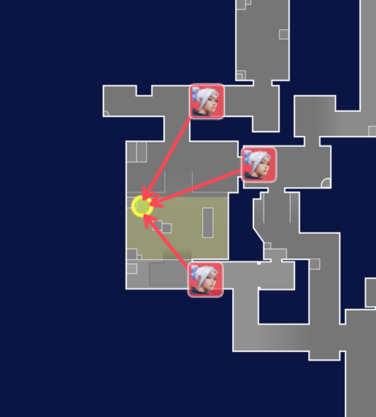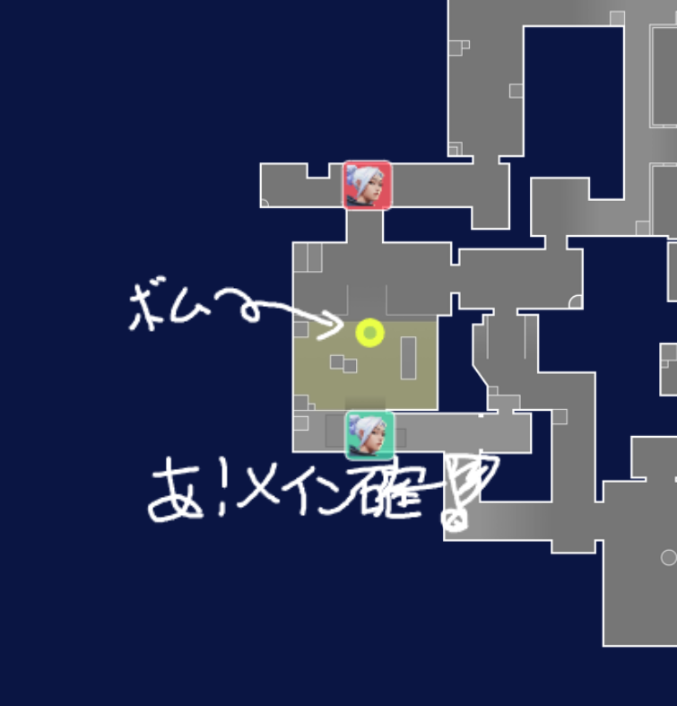 防衛側がリテイクの時に通ってきた経路からプラント位置に対して攻め側がピークしてくるであろう箇所はこんな感じでしょうか。