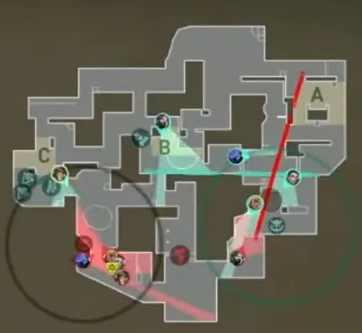 防衛側の初手のAコントロールを見てカウンターでの取り返しのフェイクをおこない、相手のリソースを削ったうえでのBサイトエントリーセットを行います。