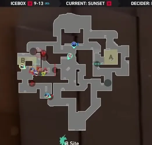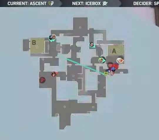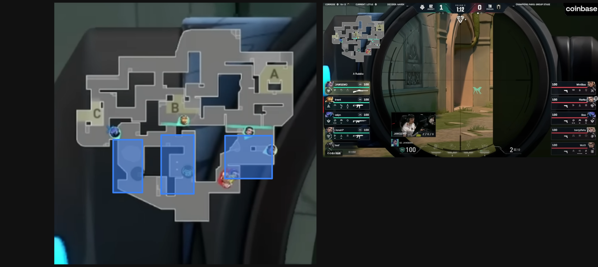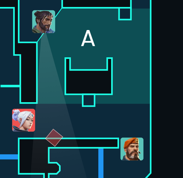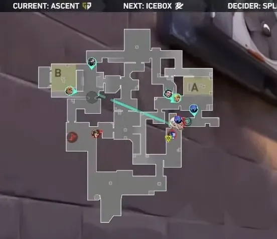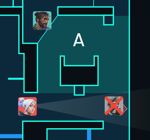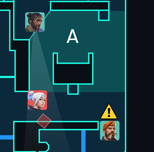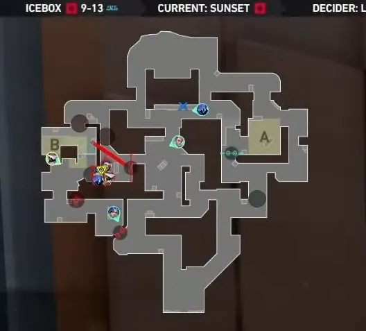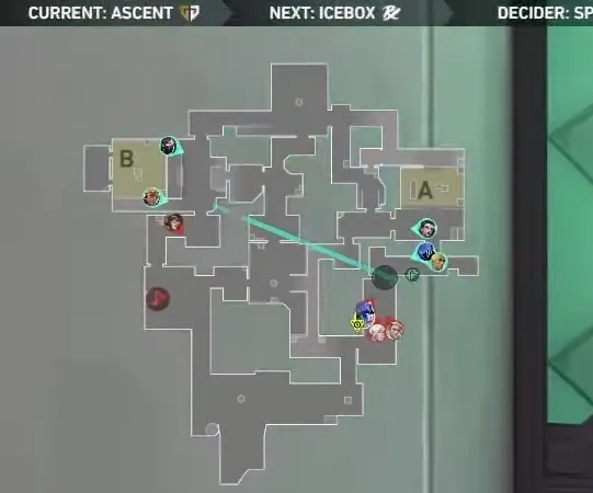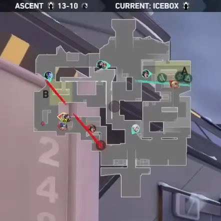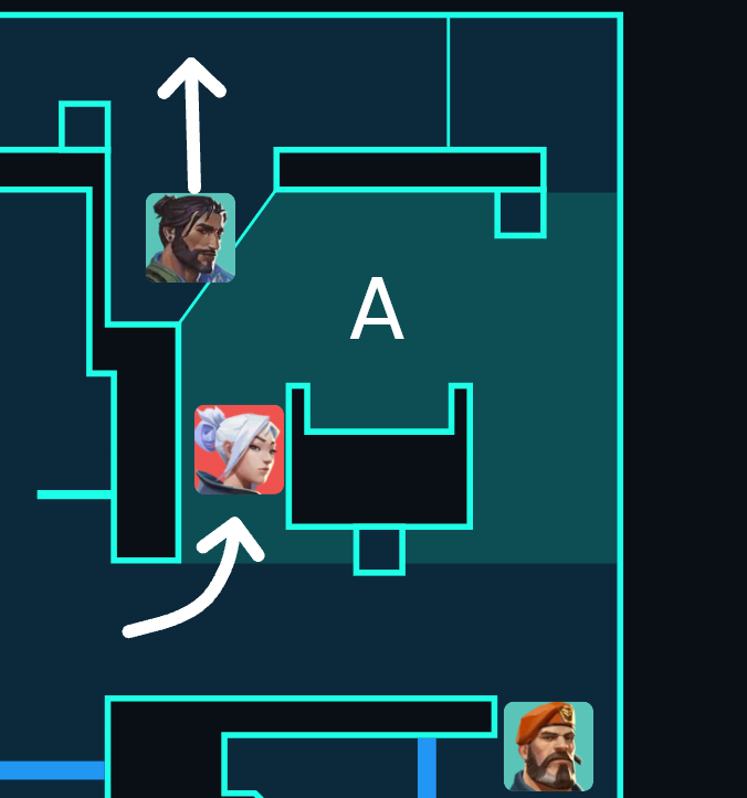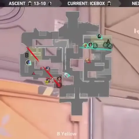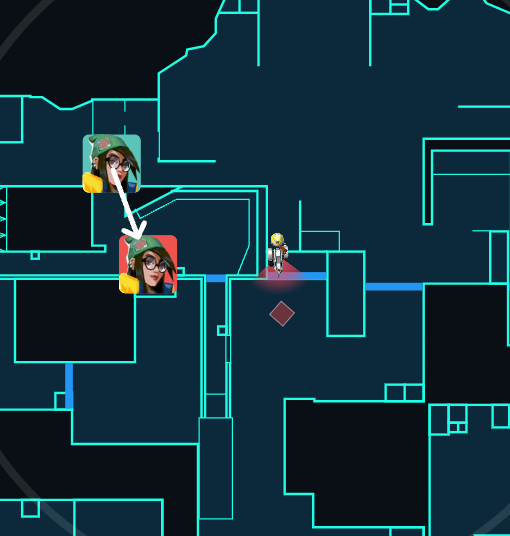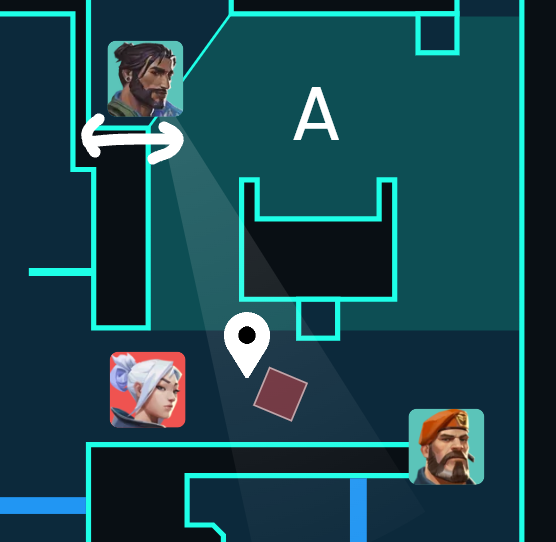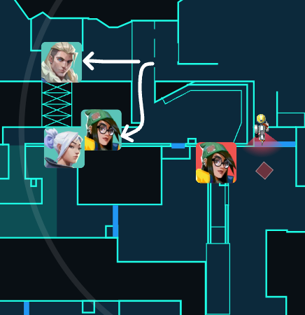 コンタクトしてすぐに勝負するのではなく、ジグルの2回目・3回目のコンタクトタイミング・もしくはJettが赤い四角の点あたりの深いエリアまでまってからそこを起点にした撃ち合いにして一緒に勝負するという形です。