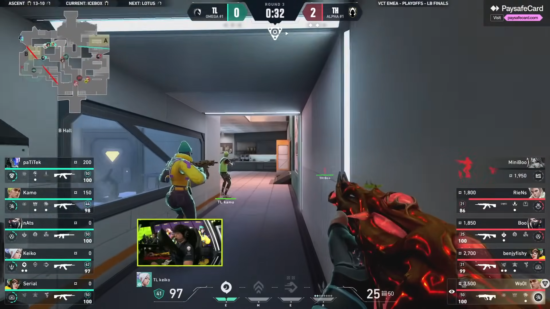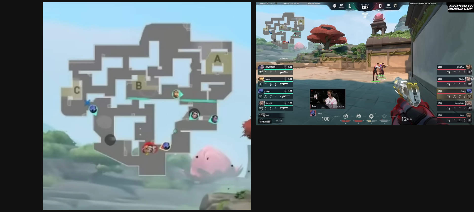 ちなみに防衛側のViperはグラビネットをよけてデスしないようにすることもできますが、防衛側のOmenが前に出るのに対してホウントを壊さないと味方を隠せないのでViperがチームのやりたいことを優先した結果、ホウントを壊すトレードでよけることができなかったという状況です。