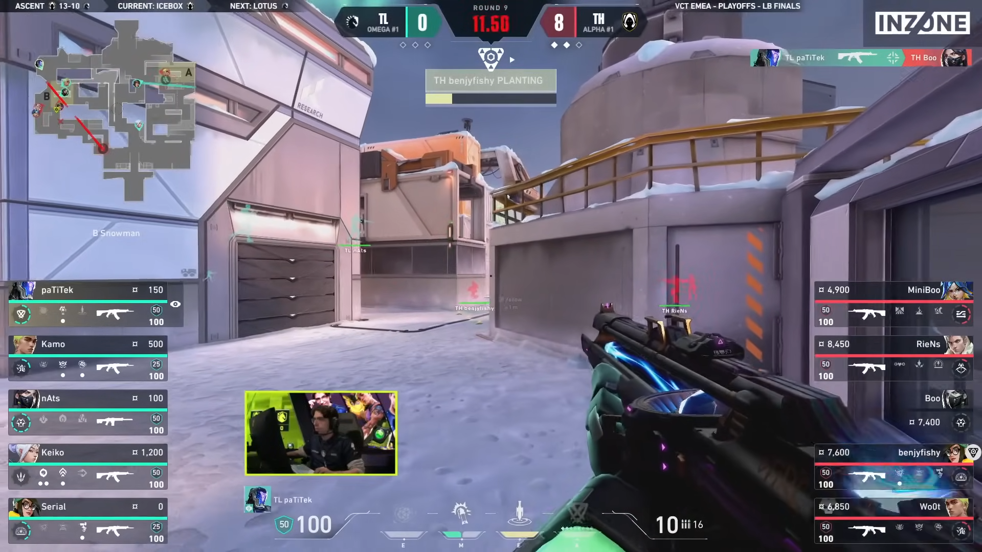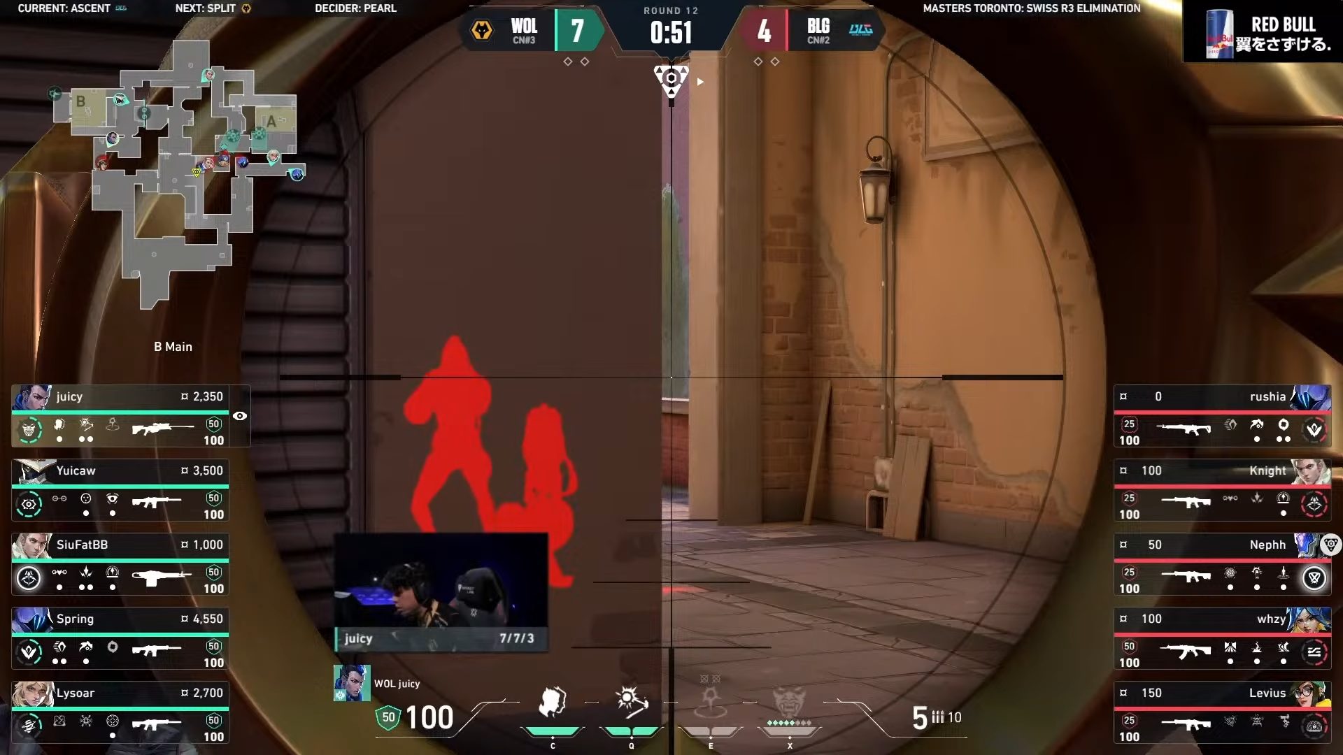 攻め側がマーケットからBに流れてくるのがほぼ確実のような状況ですが、Neonはラーク(単独行動)の動きに徹しています。