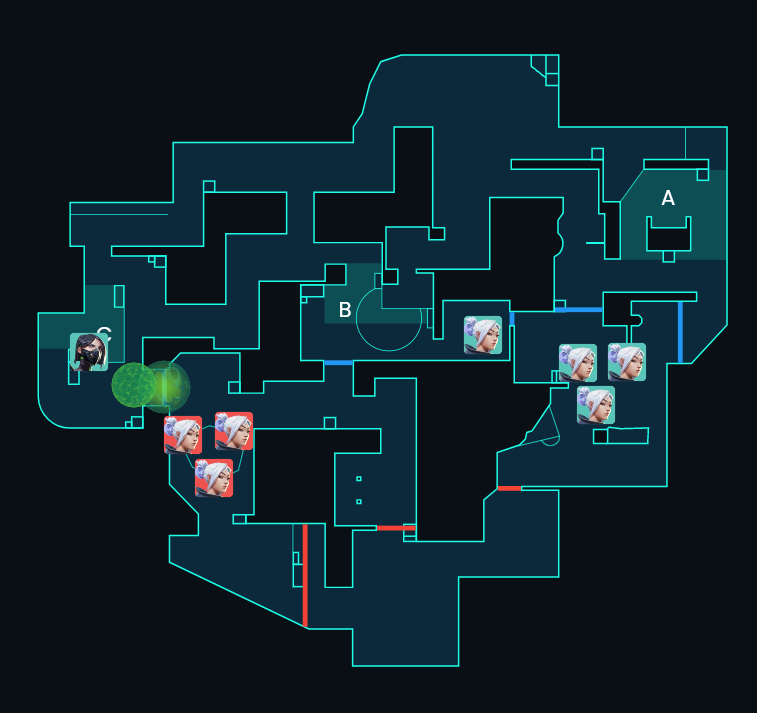 Cサイトを守るViperが、モロで一回を止められる判断でサイト内で構えていると予測します。
