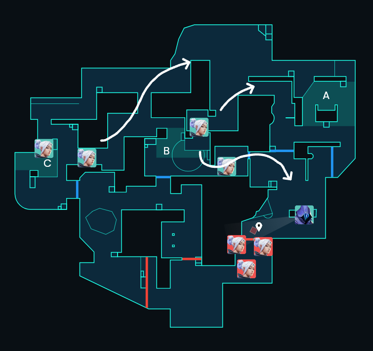 この「CサイトはViperがサイト中で遅延を狙っている」という配置を予測できれば、OmenのULTが非常に強力なカウンターとなります。