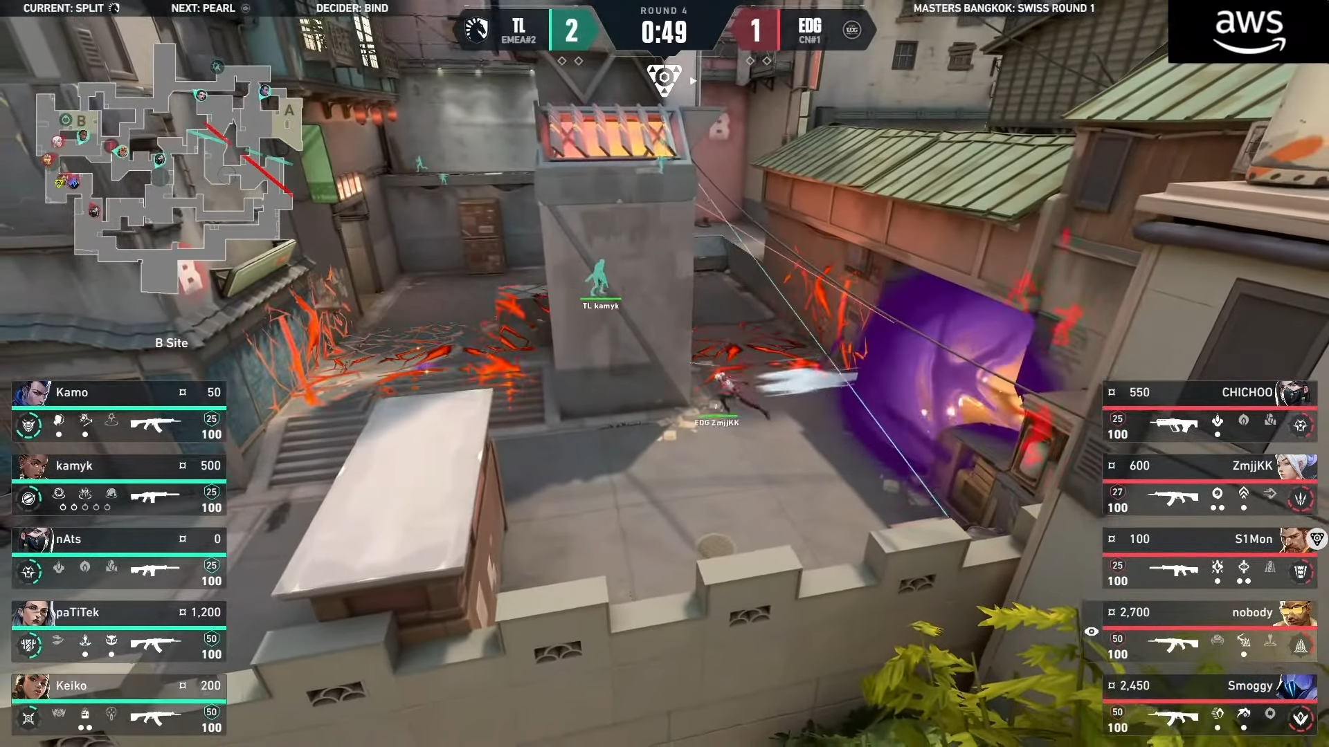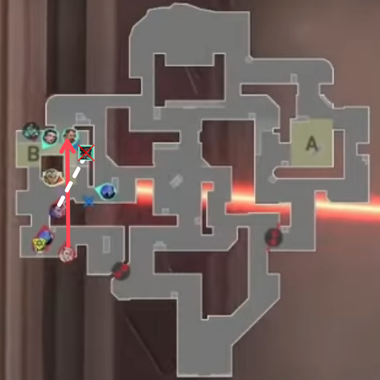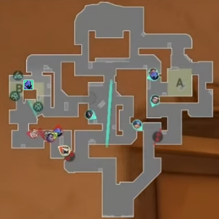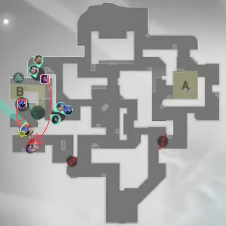 その間MIDを管理していた攻め側のCypherは防衛側がMIDをプッシュしてきているのを確認しました。人数をかけていることを予想してBラッシュはさらに加速します。
