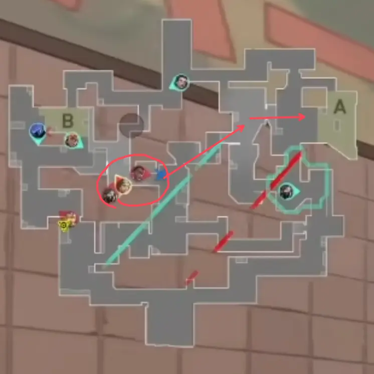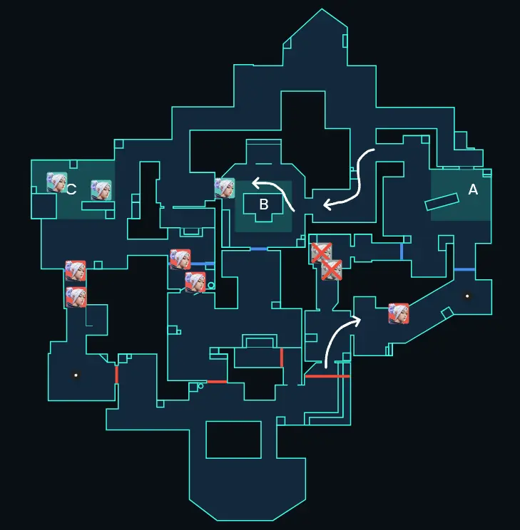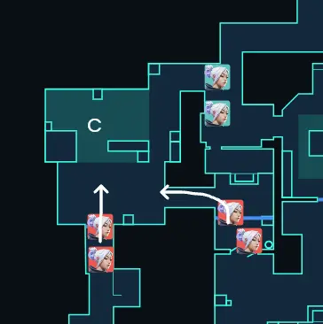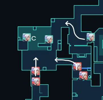 Aの択を潰された攻撃側がCへ進行を速める想定なら、Cサイトの2人はリテイクにして 3v4 を作るのも大事です。