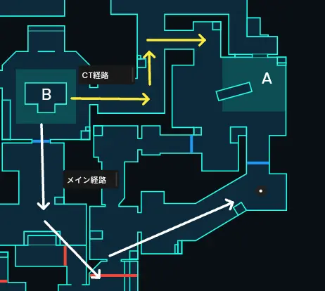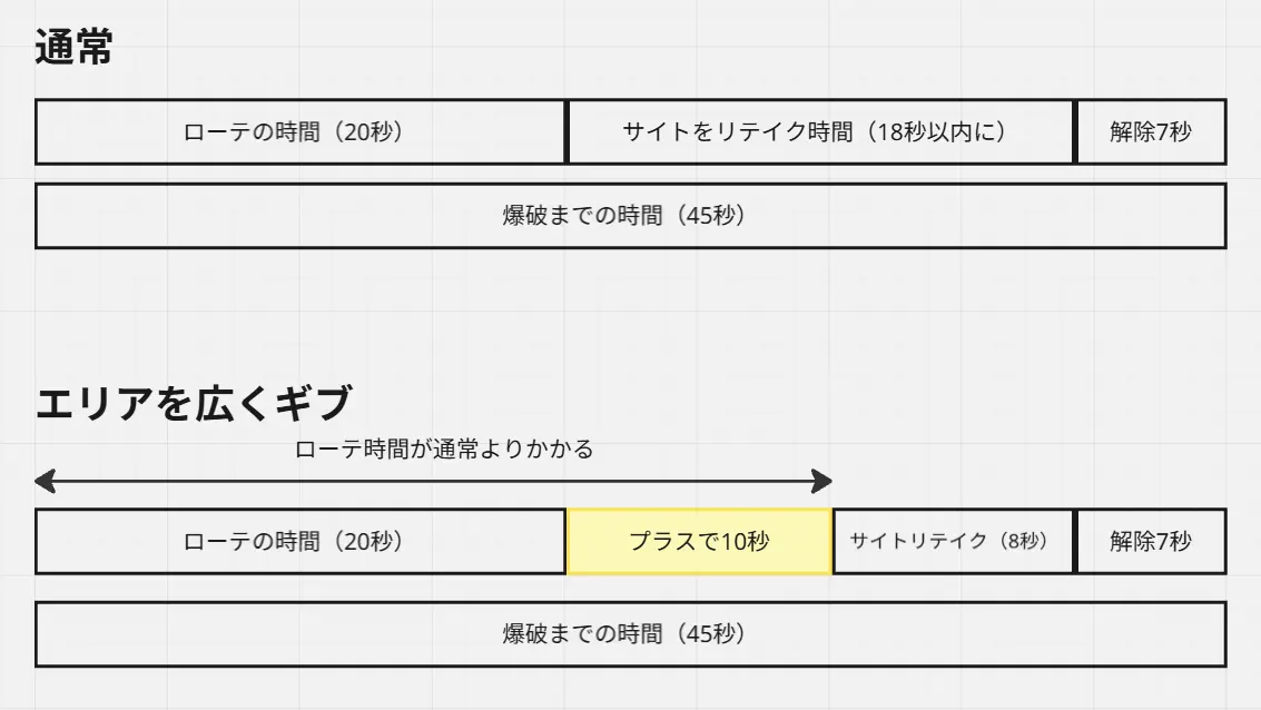 CTからローテすると時間稼ぎに付き合わされることを想定し、相手がCTに詰めてくる可能性が高いときは、敵がいない可能性の高いメイン経路からのリテイク を主軸にする価値が出ます。