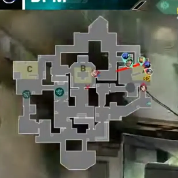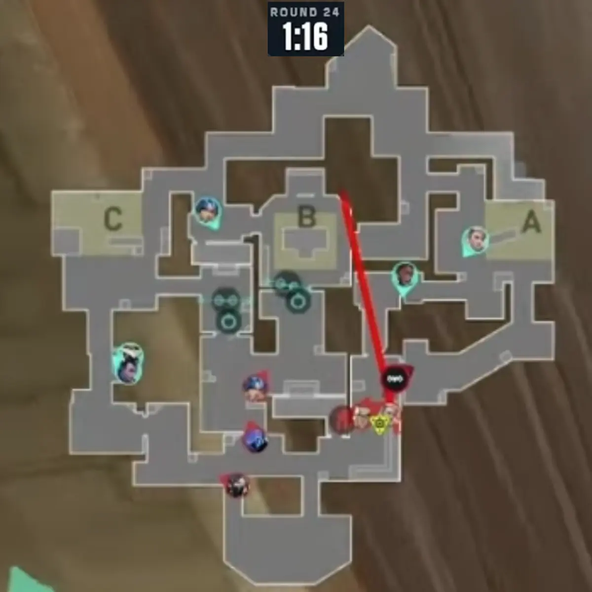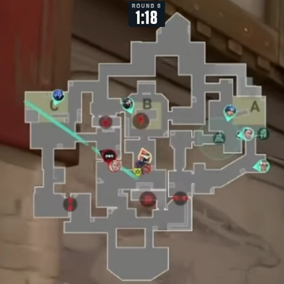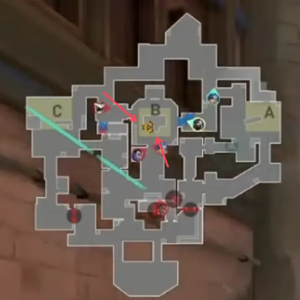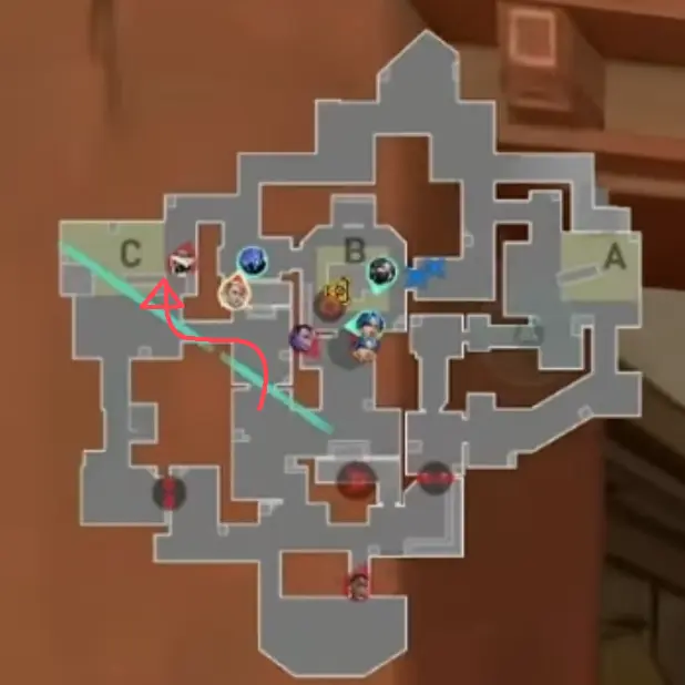 Cロング進行の攻め側に対してCypherが最初にコンタクトするようなアングルの使い方を行っています。20ラウンド目にCypherが使っていたのでCypherがここでもまた使っているという印象をあたえてYoruを隠したいからです。