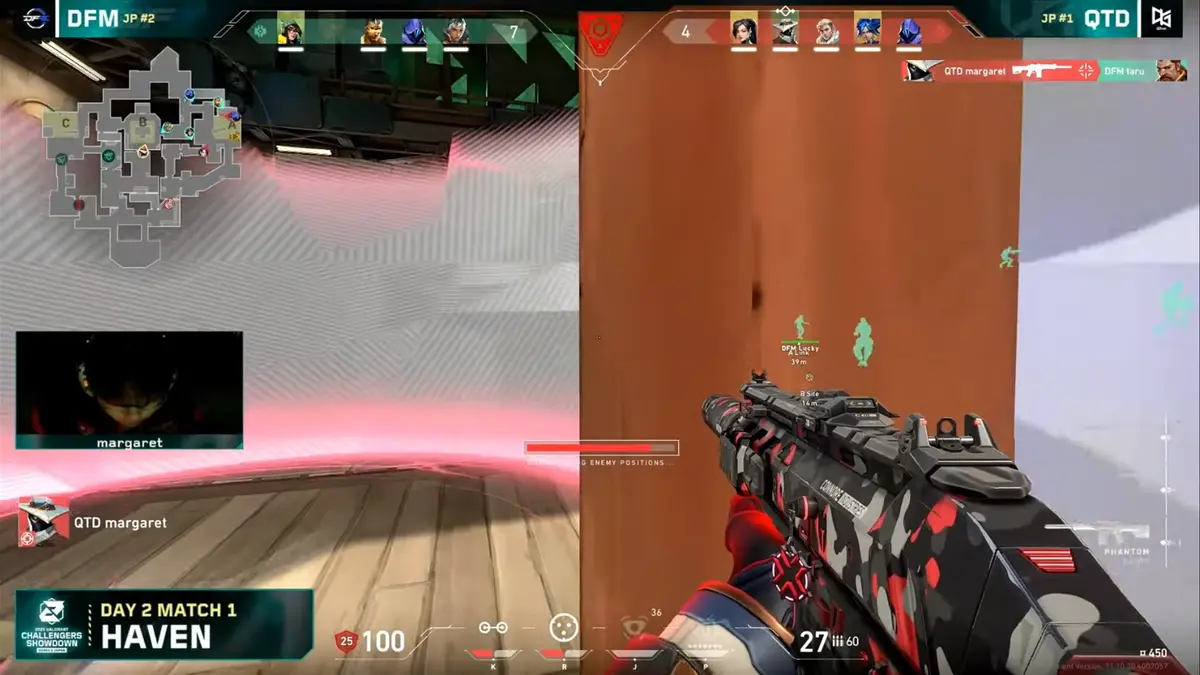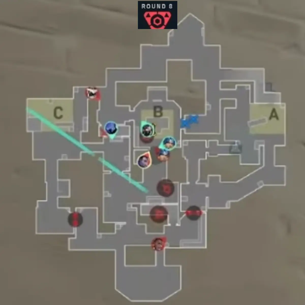 こうしたベイトを戦い方として取り入れているため、Bセットでの作戦でのガレージでのSovaを倒した後の防衛側のOmenも「2人目の可能性」を考えて、ガレージを徹底してクリアしに来ていました。