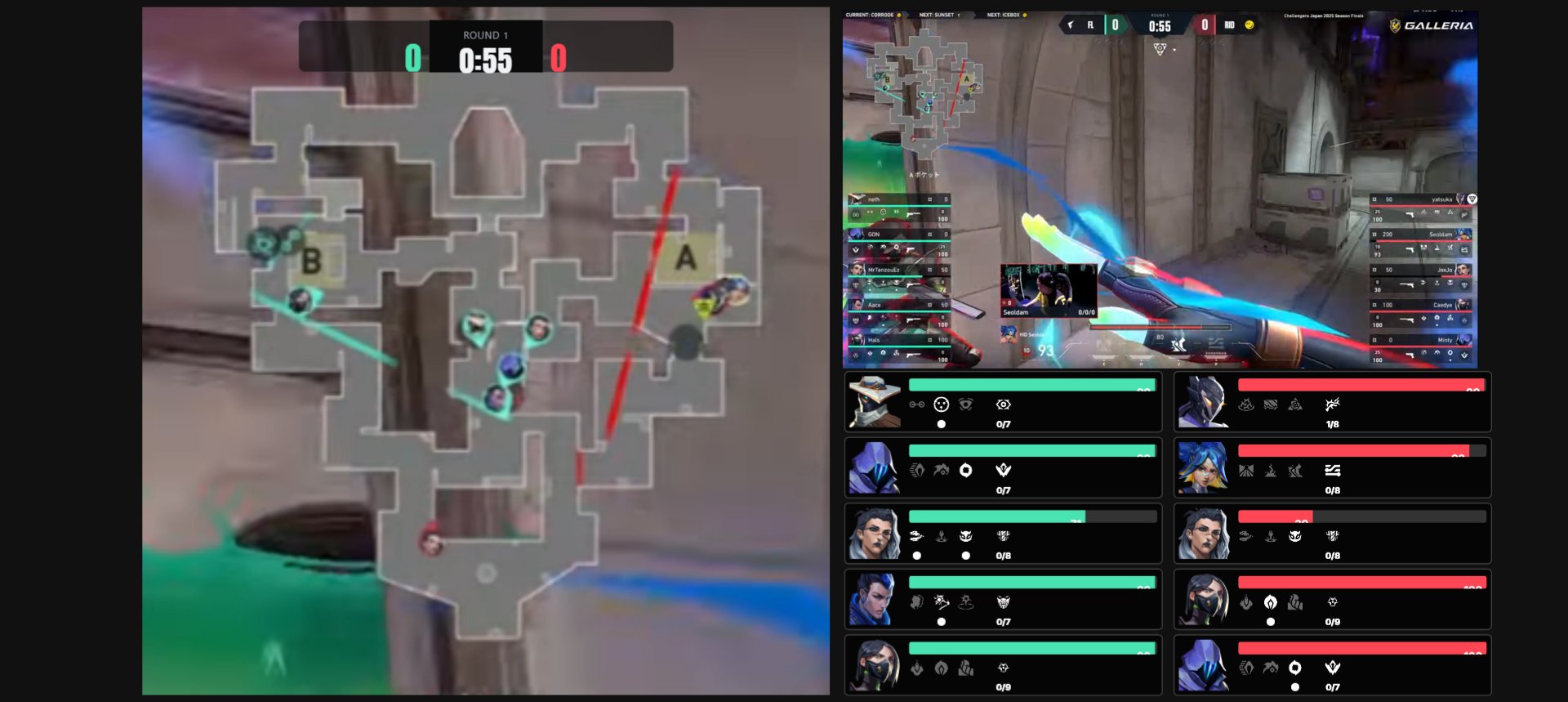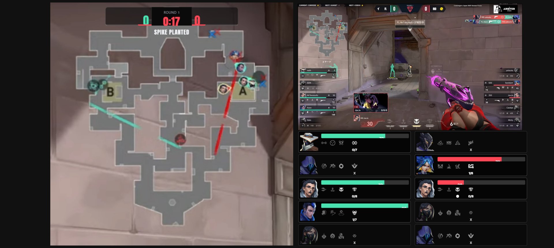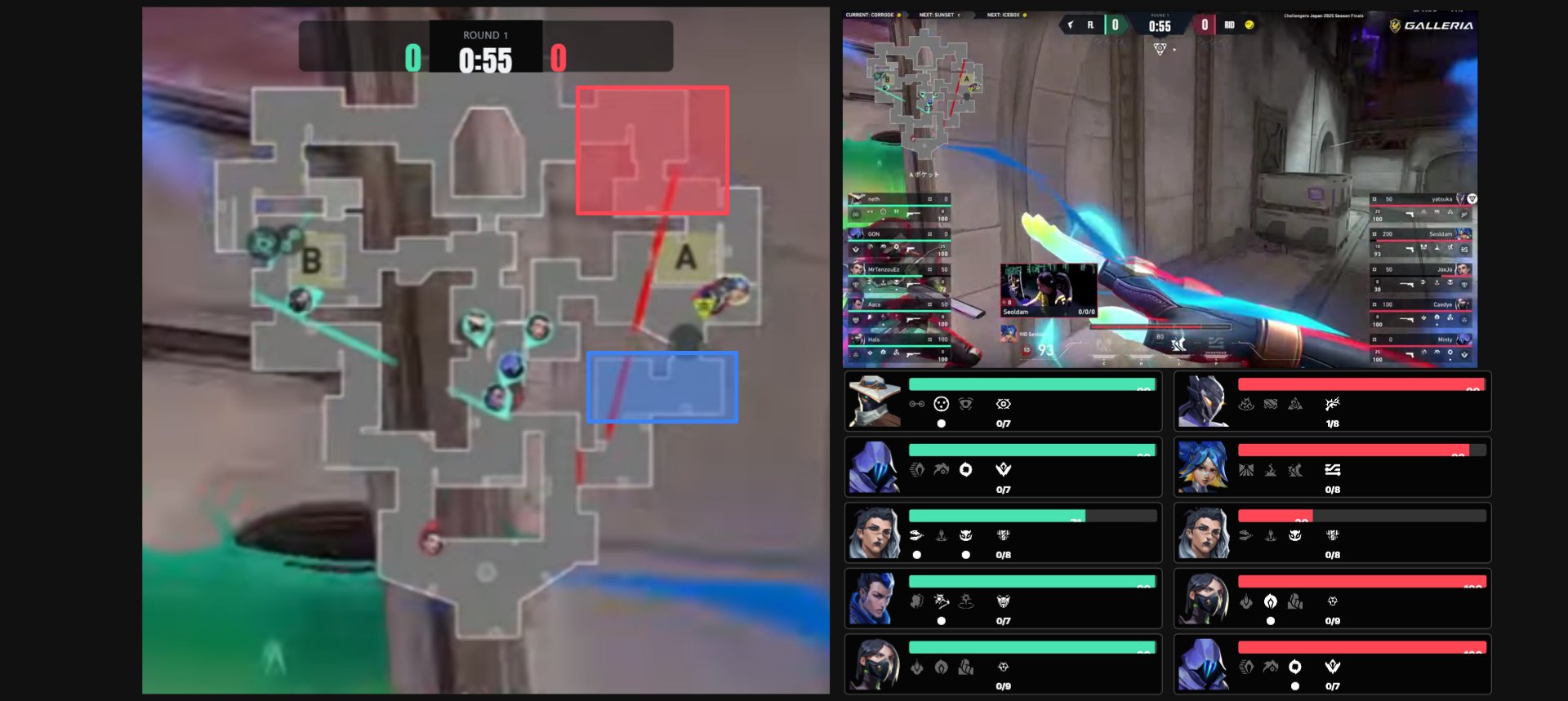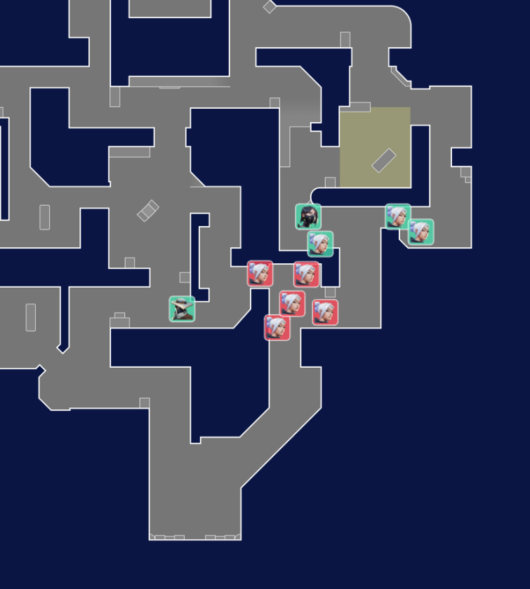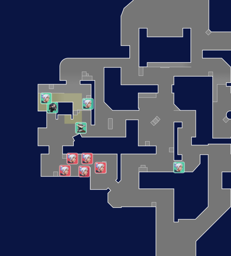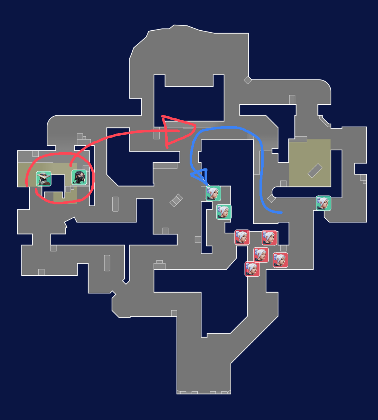 防衛側は攻め側のMIDのにおわせのアクションに対して人数を寄せてクリアリングをしに行きます。防衛側の状況としてBメインをViperが前目に抑えているのでMIDがクリアできたタイミングでA確定とわかります。