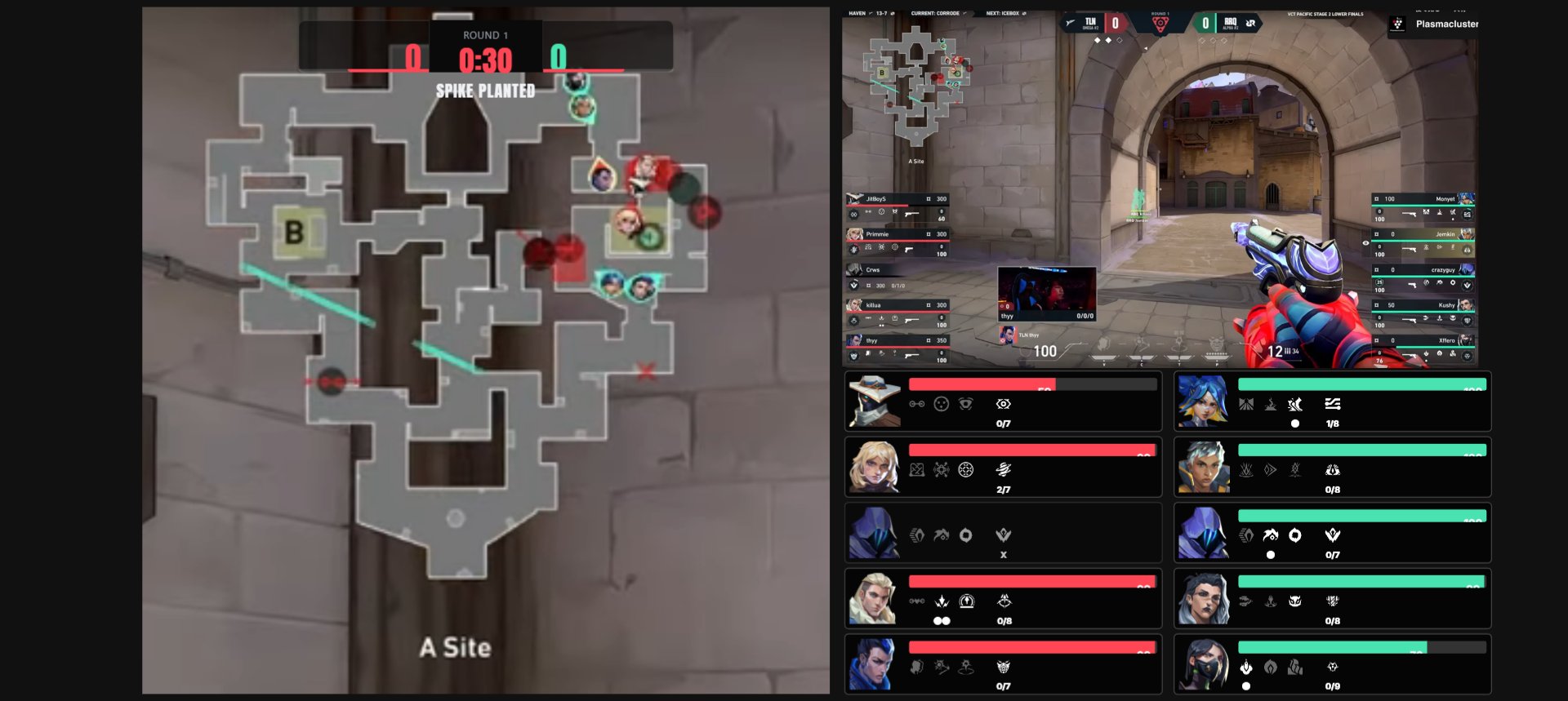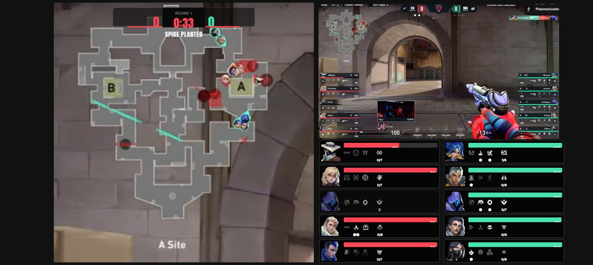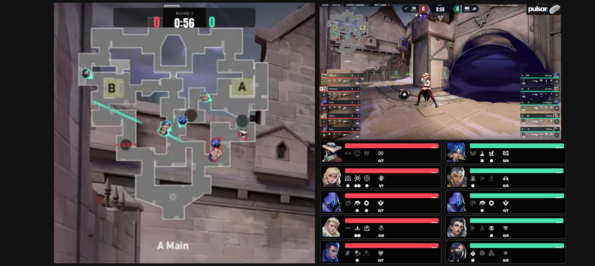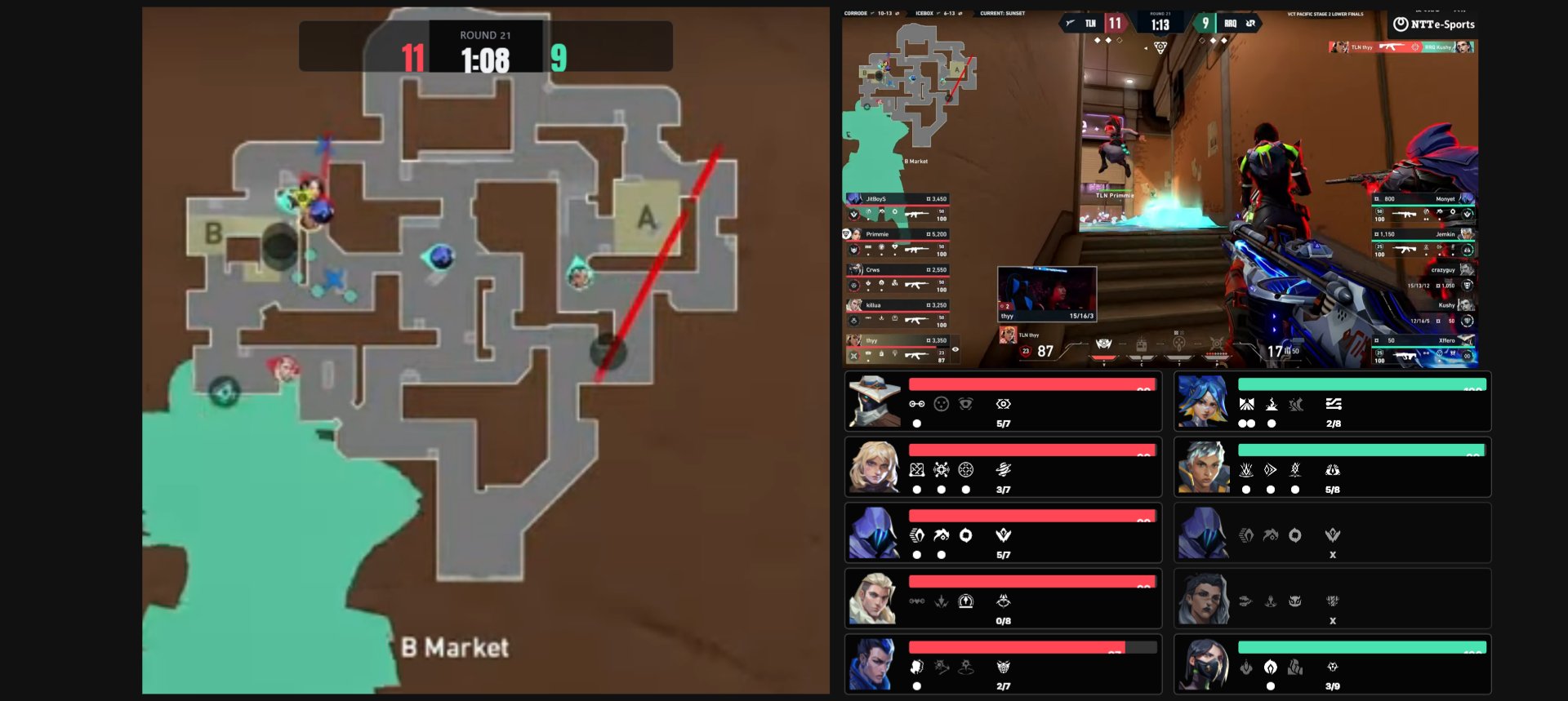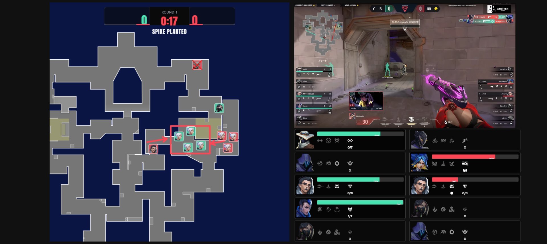 防衛側は攻め側のMIDのにおわせのアクションに対して人数を寄せてクリアリングをしに行きます。防衛側の状況としてBメインをViperが前目に抑えているのでMIDがクリアできたタイミングでA確定とわかります。